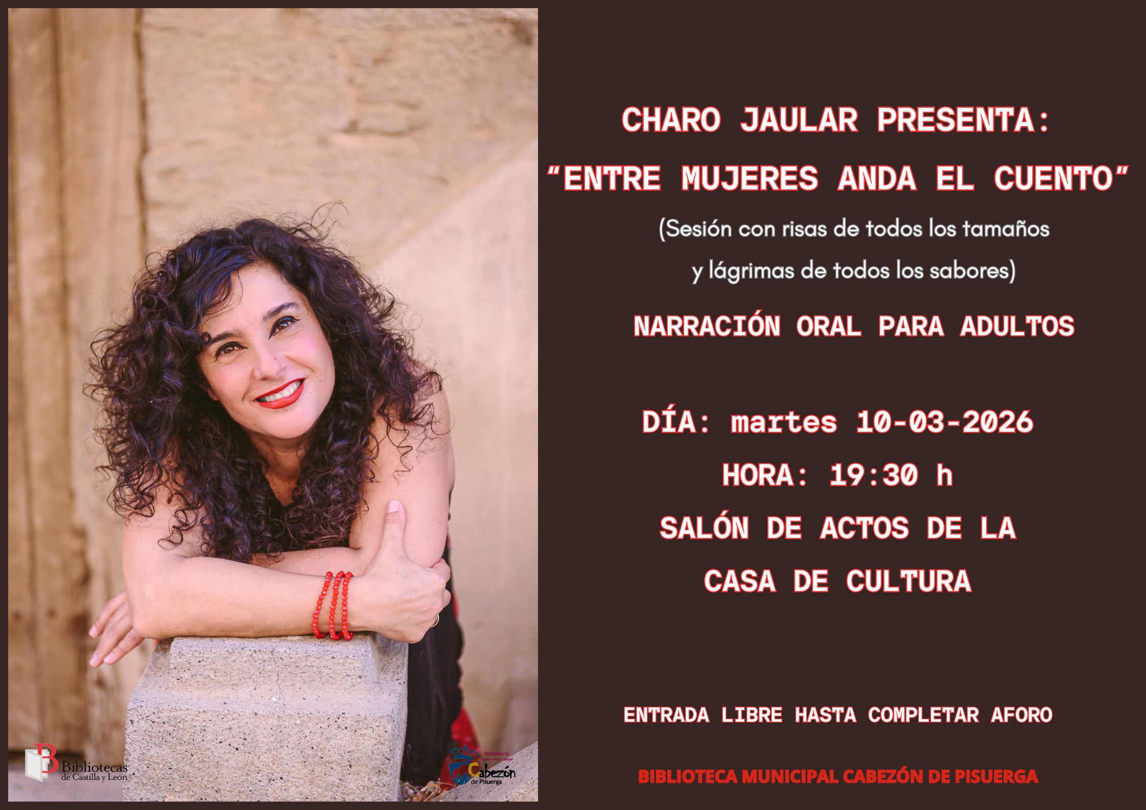 Con motivo de la celebración del Día Internacional de la Mujer el próximo día 8 de marzo, 𝐞𝐥 𝐦𝐚𝐫𝐭𝐞𝐬 𝟏𝟎 𝐝𝐞 𝐦𝐚𝐫𝐳𝐨, 𝐚 𝐥𝐚𝐬 𝟏𝟗:𝟑𝟎𝐡 𝐞𝐧 𝐞𝐥 𝐒𝐚𝐥𝐨́𝐧 𝐝𝐞 𝐀𝐜𝐭𝐨𝐬 𝐝𝐞 𝐥𝐚 𝐂𝐚𝐬𝐚 𝐝𝐞 𝐂𝐮𝐥𝐭𝐮𝐫𝐚, podremos disfrutar de una narración oral para adultos, a cargo de @charo_jaular_narradora, quien nos trae «𝐄𝐧𝐭𝐫𝐞 𝐦𝐮𝐣𝐞𝐫𝐞𝐬 𝐚𝐧𝐝𝐚 𝐞𝐥 𝐜𝐮𝐞𝐧𝐭𝐨»