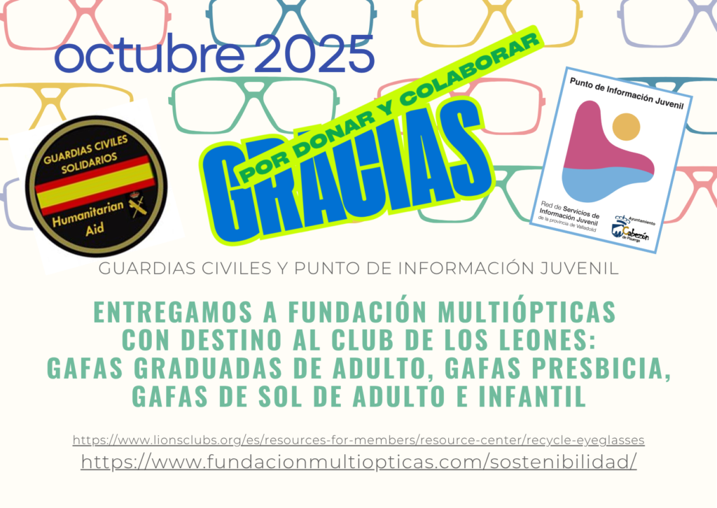 Guardias Civiles solidarios y Punto de Información Juvenil (Ayuntamiento de Cabezón), en el mes de octubre hemos hecho una nueva entrega de gafas. Muchas gracias a la colaboración de ópticas y vecinos de Cabezón.