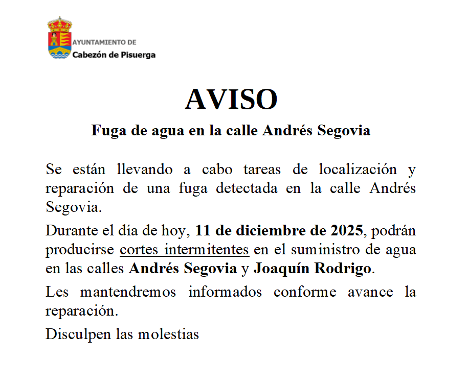 AVISO Fuga de agua en la calle Andrés Segovia Se están llevando a cabo tareas de localización y reparación de una fuga detectada en la calle Andrés Segovia. Durante el día de hoy, 11 de diciembre de 2025, podrán producirse cortes intermitentes en el suministro de agua en las calles Andrés Segovia y Joaquín Rodrigo.