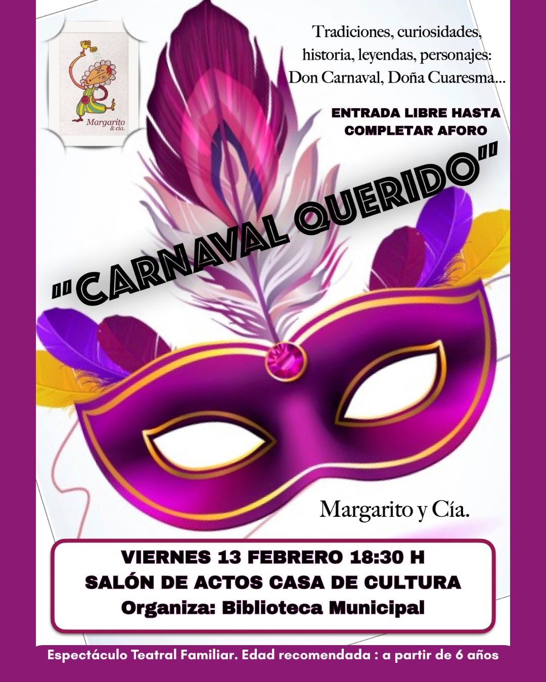 El próximo viernes día 13 a las 18:30 h, la biblioteca os invita a disfrutar del espectáculo familiar “Carnaval querido”, a cargo de la compañía Margarito & Cía. Aprenderás la historia, tradiciones, curiosidades, leyendas y personajes del carnaval, con la aparición de Don Carnaval y Doña Cuaresma.