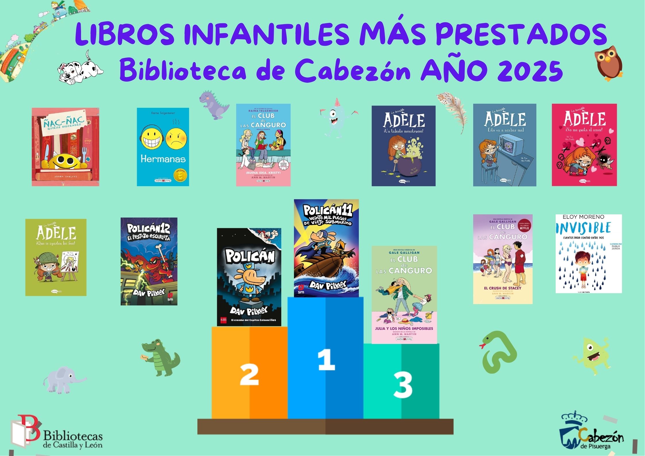 Estos son los 𝗟𝗜𝗕𝗥𝗢𝗦 𝗠𝗔́𝗦 𝗣𝗥𝗘𝗦𝗧𝗔𝗗𝗢𝗦 en 𝟮𝟬𝟮𝟱 en la Biblioteca de Cabezón. En infantil arrasan los cómics de Adèle y Policán y en libros de adulto la novela de intriga y policíaca.