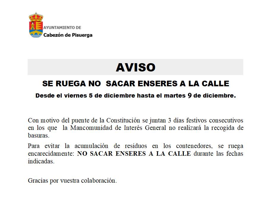 Para evitar la acumulación de residuos en los contenedores, se ruega encarecidamente: NO SACAR ENSERES A LA CALLE durante las fechas indicadas.