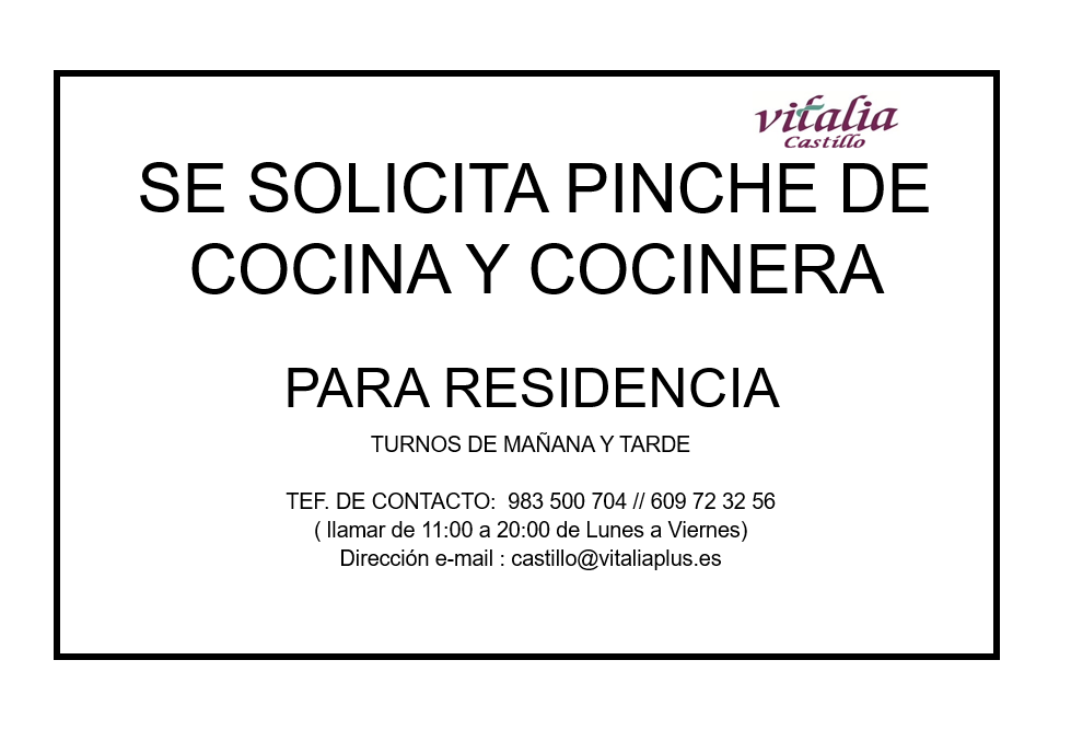 Oferta de empleo en la residencia Vitalia Castillo, buscan pinche de cocina.