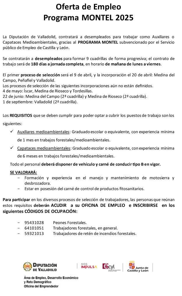 La Diputación de Valladolid, contratará a desempleados para trabajar como Auxiliares o Capataces Medioambientales, gracias al PROGRAMA MONTEL subvencionado por el Servicio público de Empleo de Castilla y León.